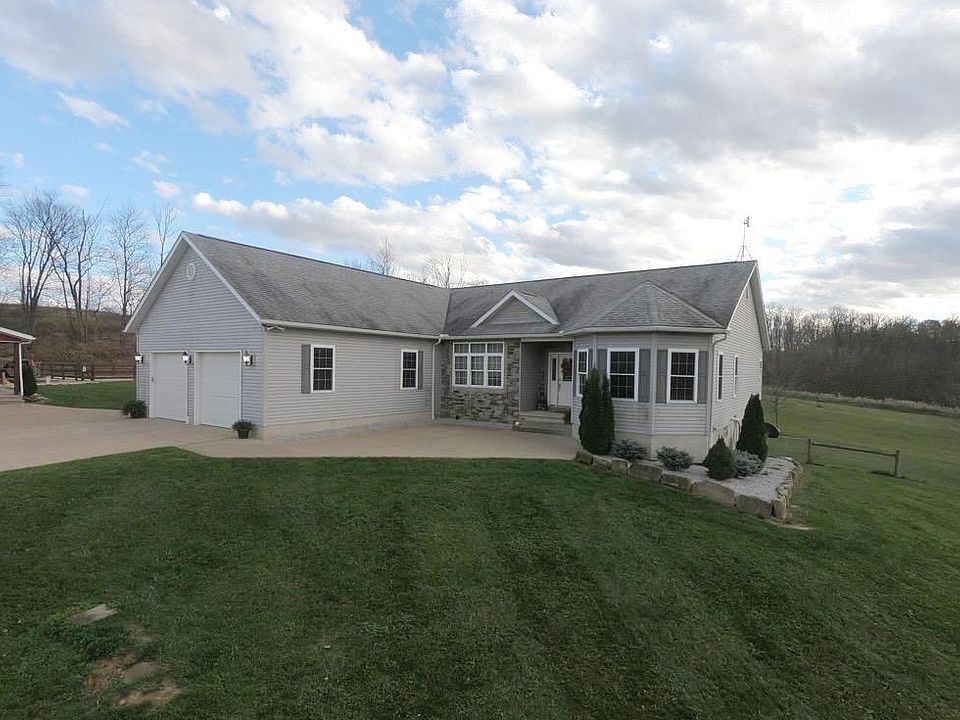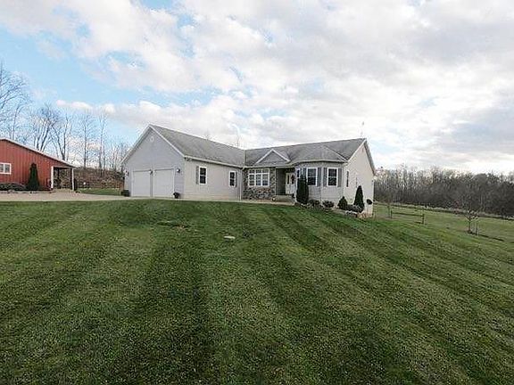 Gorgeous 11 acre mini farm, ranch home w/2500+ SF, detached workshop/garage w/heat & BA, horse barn w/2 stalls, fenced back yard, pasture, 2 ponds, 4 acres of woods, in-ground swimming pool & much more! Spacious home w/beautiful hardwood flooring, custom cabinetry, and open floor plan. First floor master features his/her walk-in closets, bath w/both shower and tub. 3 more beds and 1.5 baths on the main level as well as an office space. Walkout basement is plumbed for another bathroom, and has a wood burning stove for winter warmth. All the amenities of country living with plenty of room to roam and enjoy the outdoors. Don't miss this off-the-beaten-path mini farm!