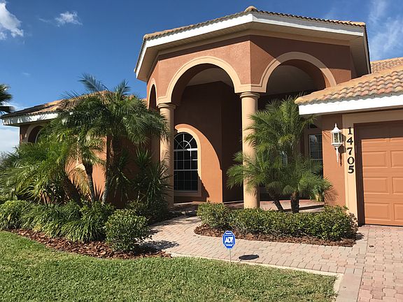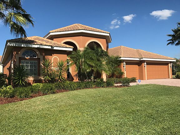 This home is truly the best available in price & features. Absolute elegance in this spectacular Country Meadows home-over 3,000 sq. ft.-4 nicely sized bedrooms, 3 full baths, 3 car garage + a den/study + heated pool/spa. .78 acre, corner homesite with water view. The perfect floor plan too. An abundance of natural light & meticulously maintained. Highlights include pavers, freshly painted interior w/a clean/crisp color palette accented with 12 ft. ceilings, tray ceilings, crown molding, beautiful brand new "wood look" tile floors & no carpeting. Opulent master suite w/walk-in closets, sitting area, built-in dry bar & indulgent master bath. Tons of storage throughout. As the heart of the home-stunning eat-in kitchen, overlooking the sparkling pool through the large aquarium glass window: new stainless steel appliances, beautiful cherry cabinetry, granite, desk, oversized pantry & tastefully done. Awesome outdoor living space-perfect home for entertaining. This is a WOW house & an easy place to call home. Close to great schools, shopping, restaurants, the airport, I-75 & world famous beaches. Come & live the FL lifestyle that you have always dreamed of...this gorgeous home is a must see & won't last. Ready for immediate occupancy.
