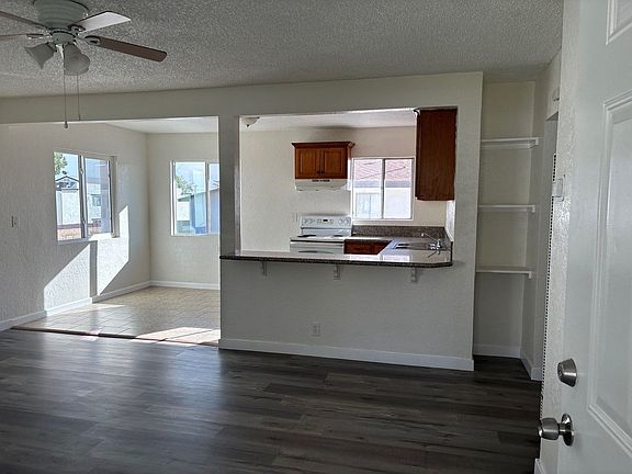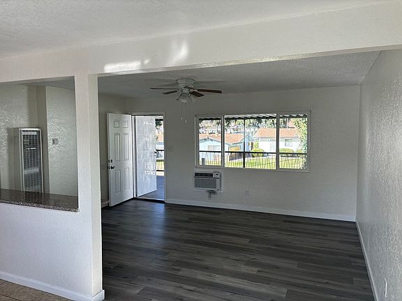 Enjoy a bright living room with laminated wood and tile flooring, a ceiling fan, and a wall AC to keep you cool year-round. The kitchen includes granite countertops, wooden cabinetry, a stove, and a garbage disposalperfect for daily convenience.