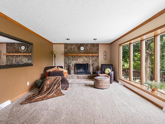 - Description: Stone wood burning fireplace, crown molding,Flooring: Carpet