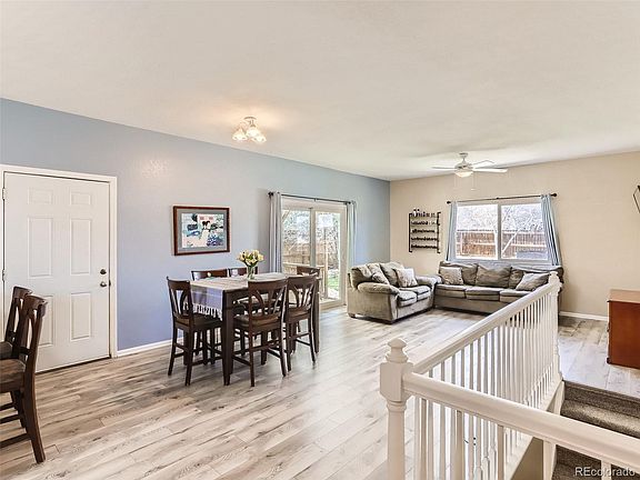 Immaculate and bright 4 bedroom/2 bath home with finished basement in Centennial Farms. NEW Main Floor-Luxury Vinyl Plank in Kitchen and Living Room/Dining Area and NEW Carpeting in the main floor bedrooms, hall and stairs to basement. Open Floor plan leads from the kitchen with pass through to the dining area and living room and on to the Laundry Room, Primary Bedroom, a Full Bath and a 2nd Bedroom. The kitchen includes Stainless Steel Appliances, lots of cabinets + a pantry. The living room opens to the pergola covered patio for that family barbecue and fenced and landscaped large back yard with garden boxes and sprinklers. Down to the finished basement with 2 more conforming bedrooms, 3/4 Bath, and a large family room with a built in entertainment center and finished extra storage room/possible office. The 2 car garage offers extra built in storage and the insulated garage door and walls keep it warmer in the winter. Walk to the Milliken Middle School and buses go to the Milliken Elementary & Charter Elem. School. Home qualifies for a low Down Payment with a USDA home loan. Quiet, small community living.