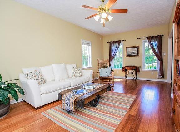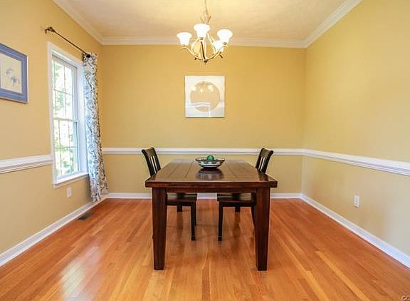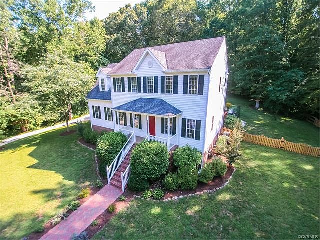 This beautiful 4-bedroom home sits on 3.6 acres in Goochland county. It has an open kitchen area with a bay window and room for bar stools and a breakfast table. The formal dining room features wood floors and crown molding. The living room has bamboo floors and a wood-burning fireplace. The master bedroom has a walk-in closet and an updated master bathroom with soaking tub. The home also includes an attic accessible by pull-down stairs. The backyard features a poured concrete patio surrounded by a low stone retaining wall. The back yard is completely fenced in and beautifully landscaped, and includes a play set for children, raised vegetable garden, and perennial flower gardens. A 1/2-mile hiking trail follows the rear perimeter of the property and leads down to the pond, which is stocked with bass and brim. The home also features a rear-entry one-car garage.
