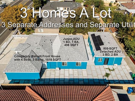 Incredible opportunity to own a newly rebuilt multi-unit property offering 3 beautifully finished homes with separate gas & electric meters in a prime Midway City location just minutes to Bolsa, Little Saigon, Phuoc Loc Tho, Mile Square Park, schools, shopping, dining, and freeways. The front house, originally built in 1956 but completely reconstructed and expanded in 2025 now offers approximately 1,518 square feet of gorgeous modern living space with 4 bedrooms and 3 bathrooms, showcasing new roof, new electrical panel, new windows, new drywall, new central A/C, new kitchen with quartz countertops, new stainless appliances, and custom cabinetry with microwave niche, beautifully remodeled bathrooms, luxury flooring, raised panel doors, recessed lighting, designer light fixtures, a spacious front concrete parking area, and an attached 2-car garage. The brand-new detached ADU offers approximately 800 square feet with 3 bedrooms, 2 bathrooms, inside laundry hook-ups, quartz kitchen with breakfast bar, self-closing cabinetry, stainless appliances, porcelain tile floors, custom frosted glass and solid wood entry door, walk-in showers with custom tile, sleek glass enclosures, designer fixtures, mini-split A/C. and solar. The attached Junior ADU features approximately 496 square feet with 1 bedroom, 1 bathroom, its own full modern kitchen with stylish shaker cabinetry, quartz countertops, stainless appliances, recessed lighting, mini-split A/C, and solar. All three homes were thoughtfully built for energy efficiency and modern comfort, boasting contemporary finishes, new systems, and separate metering, while the expansive 7,624-square-foot lot offers extended driveway access and ample parking for residents, making it exceptionally desirable for long-term rental, multigenerational living, or live-one-rent-two possibilities. This unique property delivers a rare blend of “like-new” construction, strong rental demand, and an unbeatable central location in a thriving community with market rents projected around $11,000 per month—an outstanding opportunity for investors or owner-users seeking high cash flow, modern comfort, and long-term value.