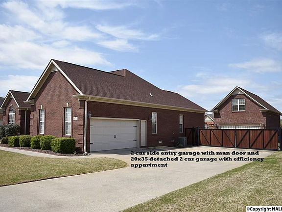 Conveniently located to Athens and Huntsville.Hardwood and tile floors throughout the house.Great open floor plan, high ceilings,crown molding,gas log fireplace,built in bookcases,granite counter tops, tile backsplash,gas cooktop, Isolated Master Bedroom with sitting area, walk in closets, large glamour bath, Laundry room with built in cabinets, jack and jill bath to secondary bedrooms, and 1/2 bath for guests. Wonderful sunroom heated and cooled.Rinnai Hot Water Heater.Side entry 2 car garage and oversized detached garage with efficiency apartment upstairs with kitchen& 3/4 bath.Detached garage and apartment have separate HVAC unit from the house.Rush to see this one! Move in ready.