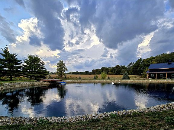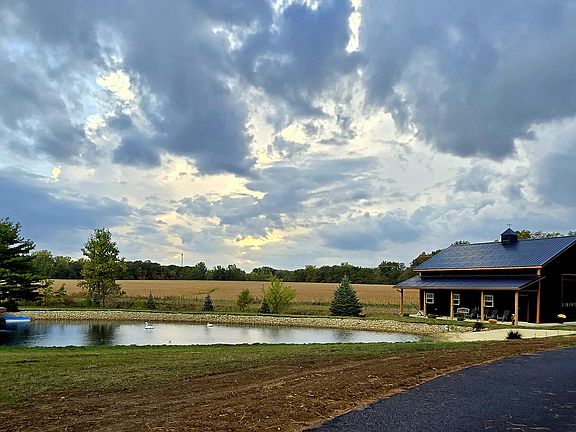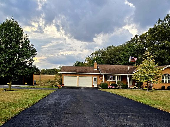 Country living with quick access to shopping and restaurants. This lovely single story ranch home has 3 bedrooms, 2 full baths and a fully finished walk out basement. Newly repainted and updated Kitchen. Ample closet space throughout the home. The master suite has a cathedral ceiling and large walk-in closet. Main bath on the first floor has heated flooring for the chilly mornings. A hand crafted wooden spiral staircase leads you down to an additional 1200 sq/ft that includes a custom-built wet bar for entertaining family and friends and a gas fireplace where you can relax on cold winter nights. Extra space in the basement for a gym/office located next to a large laundry room. The heated workshop and additional storage room are both located outside beneath the large deck. A two-car heated garage with even more storage. Beautiful covered front porch. A must-see new Amish-built 30x40 insulated pole barn built in 2023 overlooks a 19 ft deep stocked pond with a well-maintained swimming and beach area. The barn has concrete flooring, electric throughout and propane heat. A new blacktop driveway was added in 2024 to allow easy access to the barn and beautiful pond. Don't miss this opportunity. Make this your forever home.
