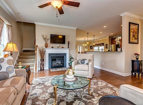 Single story Skybrook living at it's finest! This delightful ranch home is the perfect blend of style and simplicity. With a welcoming front porch and a beautifully maintained yard, you'll feel right at home before you even step inside. The large kitchen is open to the great room and features a breakfast bar, granite counter tops, ceramic tile back splash, stainless steel appliances and beautiful 42" upgraded cabinets with crown molding. Interior features include: gas fireplace, hardwood floors, crown molding, and a gorgeous owner's suite with walk in closet & bathroom with dual sinks over sized shower. Exterior Features: 2 car-rear entry garage, front porch, HardiePlank siding, and covered side porch. Enjoy maintenance-free living; lawn care is included in the quarterly HOA. Located on a corner lot close to the community pond and one of the community playgrounds. Don't miss out on this one! Community Swim and Raquet Club & Golf Club memberships are additional.