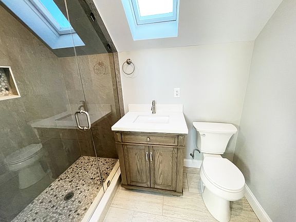 This beautiful, bright, open floor plan unit features newer fully applianced eat-in kitchen w/quartz counters, skylight and stainless steel appliances, large cathedral ceiling living room, big cathedral ceiling bedroom, nice 2nd bedroom, beautiful tiled skylit bathroom with awesome walk in shower, central air, rear porch, thermo windows, fresh paint and in unit washer and dryer!