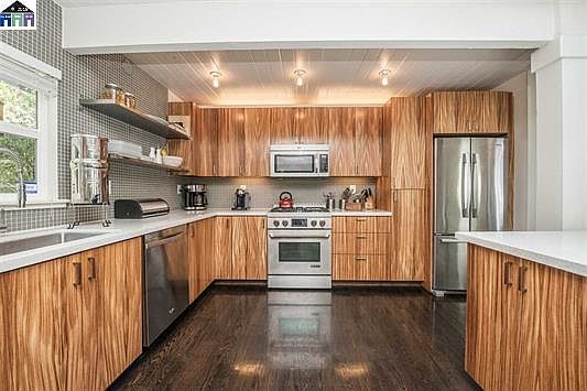 Magical, light-filled midcentury that embraces you the moment you walk through the front door. This 4 Br/3 Bth home with 2,170 Sq.Ft. of living space sits on a 4,720 Sq. Ft. lot with professional landscaping in both front and back designed to enhance the home's private and serene setting. On the main floor you'll find a bright, open living space highlighted by floor to ceiling windows and deck offering partial Bay and SF views; a master suite with walk-in closet; and second bedroom and full bath. The lower level offers 2 more bedrooms and full bath, along with a large family room that opens to a travertine patio ideal for entertaining. The home was completely remodeled in 2011, including new foundation and roof and all new kitchen and baths. Nestled in the idyllic Berkeley Hills, yet only minutes from downtown and BART, this home offers the best of both worlds! Open House Sat/Sun 8/3-4 and 8/10-11 Noon - 3pm Twilight Open Tues. 8/6 6pm-8pm