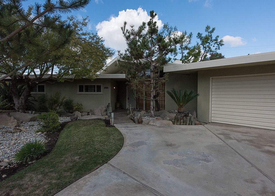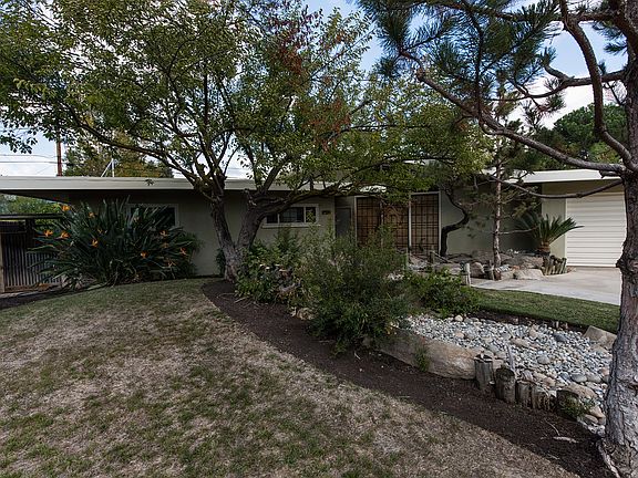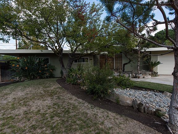 Fantastic, meticulously maintained Mid-Century Modern home on beautifully landscaped grounds in a peaceful Bullard High area cul-de-sac. This home is truly a gem with classic mid mod details including soaring beamed wood ceilings & an angled wall of brick with pass through fireplace & planter separating the large open living room, separate family room/den, kitchen & dining. Walls of glass with shoji screens and architectural details offer views of the lush, maturely landscaped gardens and recently redone pool with striking multiple fountain water features. The refreshed kitchen includes generous counter space and storage overlooking dining with garden and pool views. The West wing of the home offers two bedrooms, remodeled bath, lg laundry/utility room, and grand master suite with skylight, garden/pool/patio access and enormous master bath with over-sized tub and shower. The brilliant details, classic style, sublime grounds and pride of ownership make this home a rare treasure.