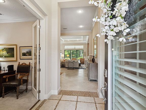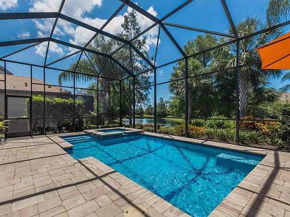 This meticulously maintained Neal home features 3 bedrooms, 2 bathrooms, and a versatile office/den. Upon entering, you're welcomed by soaring 13-foot ceilings and elegant 8-foot doors, creating a sense of grand sophistication. The home is adorned with upscale touches, including crown molding, plantation shutters, window trim, hurricane shutters, automated hurricane shade, and landscaped lighting. Recent updates, such as new carpeting and fresh interior paint, ensure this home is move-in ready. The kitchen, truly the heart of the home, boasts an oversized island, stainless steel appliances, dry bar and a view that extends over the living room and dinette. Aquarium windows provide a stunning outlook onto the lanai, which features an oversized screen cage, a sparkling pool, and a spa with a breathtaking water view. The master suite is a private retreat, offering his and her walk-in closets, dual vanities, a walk-in shower, and a private water room. Additional features include a whole house generator, a reverse osmosis system, and a water softener, ensuring comfort and convenience throughout the home. Located in the desirable Country Club East, this home offers an array of amenities, including 3 pools, 2 clubhouses, a fitness center, and private roads. Optional membership unlocks access to 3 exclusive restaurants, 4 renowned golf courses, and pickleball and tennis courts. Centrally located, this community provides easy access to fine dining and shopping at Waterside, UTC Mall, and Main Street. It is also conveniently close to both Sarasota and Tampa airports and just a short drive from the nation's most beautiful beaches.