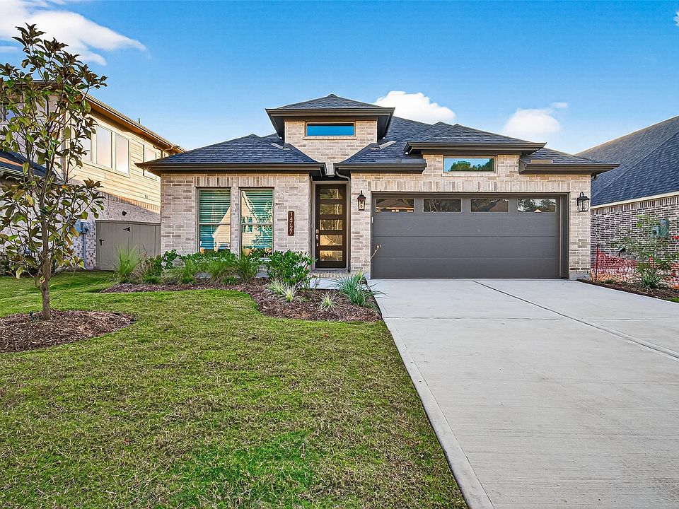 Single-story Perry Homes. Brick/stone elevation with covered entry. Foyer opens to an open-concept kitchen, dining, and family room. The kitchen includes a center island and a walk-in pantry. 4 bedrooms and 3 full baths. Rear primary suite with walk-in closet; primary bath with dual sinks and separate tub/shower. Secondary bedroom wing with shared bath. Utility room, covered patio, and 2-car attached garage.