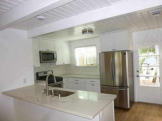 This fully remodeled, three bedroom, two bath house has a spacious open floor plan that is filled with light. It features hand textured plaster throughout, wide plank floors, dual pane windows and two-inch cordless blinds. There is central heat and air conditioning. The bright, open, roomy kitchen has white cabinets (with soft close drawers and doors), quartz counters, stainless steel fridge with icemaker, dishwasher, generous stainless sink, disposer, microwave, and gas stove with self cleaning oven. The counter seats four. The hall bathroom includes a floating marble topped vanity and toilet with soft close seat. The tub surround has no grout lines and semi-frameless glass doors. The master bath features a cultured marble shower with frameless glass doors. The floating vanity has two sinks and carrara marble counter. A energy efficient, tankless water heater provides endless hot water. All light fixtures are energy efficient LED. The large capacity, front load washer and dryer are high efficiency units. The roomy back yard includes a large covered patio and lawn with automatic sprinklers. Lawn service is included Owner pays for yard service. Tenant pays all utilities. Owner prefers no animals, but will consider, at owner's sole discretion with increased deposit. Owner pays for yard service. Tenant pays all utilities. Owner prefers no animals, but will consider, at owner's sole discretion with increased deposit.
