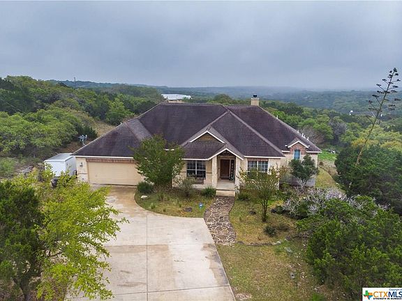 Texas Hill Country home with open floor plan. Enjoy the breathtaking views of the hill country from the back porch or through the large windows in the living area and master bedroom. Newly installed carpet and fresh coat of interior paint. New kitchen sink and faucet. A second, detached garage sits below the house for extra space and storage.