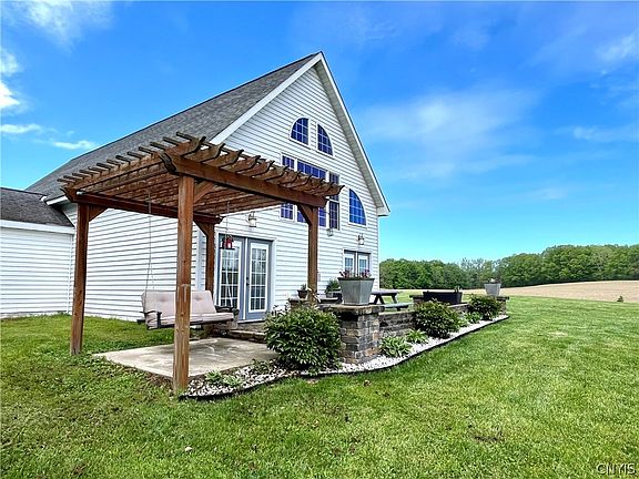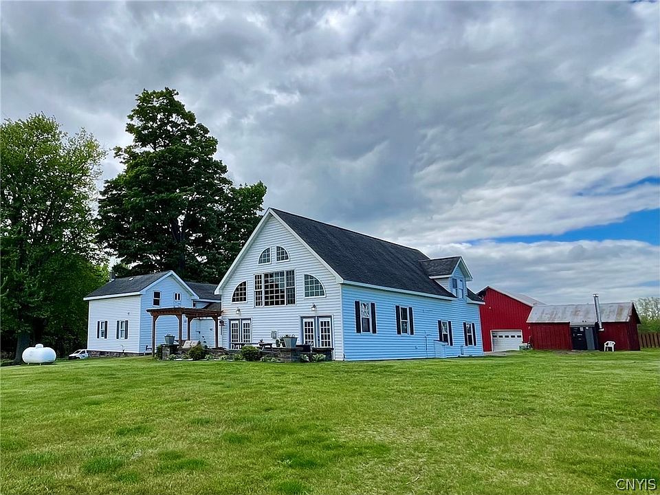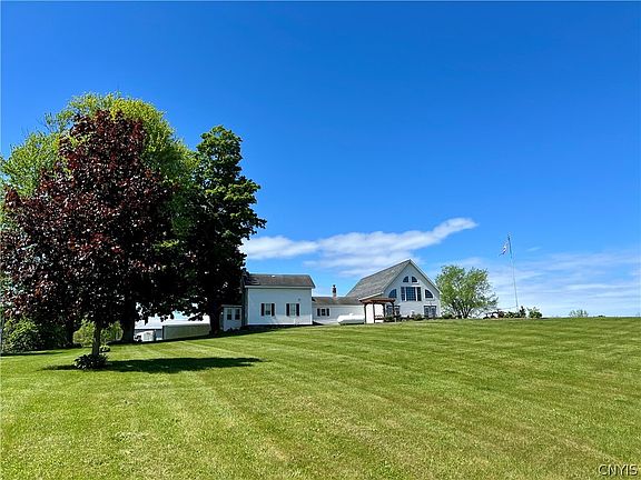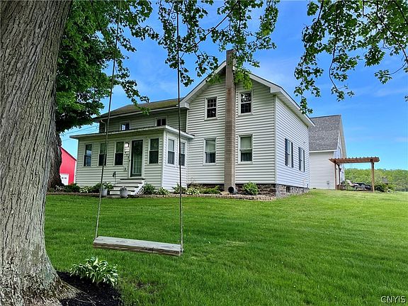 FRESH & FABULOUS- VINTAGE FARMHOUSE w CONTEMPORARY FLAIR! This Unique expansive home includes contemp addition GREAT ROOM w/wall of windows, Cathedral Pine Ceilings, Gas Fireplace, half bath & surround sound! Walk out onto the Patio - it's the perfect spot for entertaining - spectacular views & Pergola w/swing! Tasteful eat-in kitchen offers WalkIn Pantry, lots of cupboard space, center island, newer appliances, breakfast alcove & cozy woodstove w/stone accent. Form dining rm leads to encl. front porch. 2 BR's on the 1st floor, Primary BR in the loft of the great room. 1st floor Bath has both tile shower & tub! Big garage has radiant heat flrs. Foyer/entry is so welcoming! The HUGE in ground pool is ready for you & has covered patio for lounging. Big pool/party house has bar & bathroom too! 3 BARNS for homesteading, classic cars, tractors, RV's & MORE! Dairy Barn, w/ second story, Hay loft, Pole Barn for Equip. & Toys w/wood stove! EXTRA barn w/pen & chicken coop! Heat options incl Outdoor wood boiler, in-floor heating, forced air, gas fireplace & wood stove!! Big Expansion space upstairs awaits your ideas/finishing So Private- rollIng fields and Not a neighbor in sight! WOW!