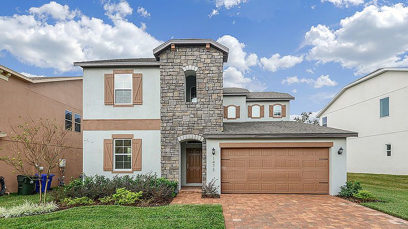 The Castlemore at Arden Park is a two-story, large family home offering an open floor plan with great room, kitchen, and breakfast nook. The great room provides plenty of natural lighting and allows access to a paved lanai with scenic views. The kitchen features modern white-finished cabinetry, solid surface countertops with tile backsplash, an oversized island with flow through bar top, and stainless steel appliances (including a double oven). The first floor also offers an adjoined living and dining area with elegant tray ceilings. The lofted second-story (with views to the great area below) completes this home with four bedrooms, two full baths, and game room.
