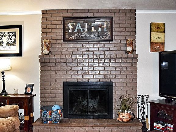This home has a fresh coat of paint and a brand new stonework to accent. Both bathrooms have been updated with beautiful granite countertops and sparking white, drop-in sinks. Both the living room and den have fresh coats of paint and crown molding. The den features a sliding plantation shutter over the sliding glass door, as well as a painted brick, wood-burning fireplace. The living room has been enclosed with custom french doors and a sliding barn door. The kitchen has updated tile flooring and an accent black brick wall. The kitchen countertops are next to be updated. The flooring throughout the living rooms and hallways is a beautiful rustic auburn laminate. The four bedrooms have brand new plush carpet with premium padding underneath. Backyard was stripped of landscaping to add all concrete decking and a gorgeous sparkling pool. Very refreshing on these hot summer days! Solar panels on the rooftop contribute to low power bills.