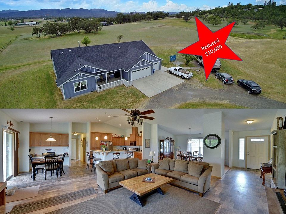 Practically New(2016), Single level home, on 5 Beautifully usable acres, 4brms, 2.5bth, 3car gar, amazing views on quiet country road minutes to town. There is so much potential to Build a barn or shop, raise a horse or two. Motivated Seller. This Peaceful property sits high enough to have gorgeous views of the hills and Mt McLoughlin. Everything you want inside: very spacious, open concept floor plan with a formal dining room, breakfast nook, oversized rooms and added interior wall insulation for sound. The master suite is Huge with a walk-in shower and soaker tub and Dual sinks in the bath. The 2nd and 3rd Brms are on the opposite end of the house. The 4th is currently an office with no closet; there's tons of space for one. The perfectly placed kitchen is set back so it's not the first thing you see, but still in the heart of the home. Outside there's a circular driveway and compacted RV pad, large back deck and front patio to enjoy the gorgeous view of the hill. Eagle Point Schools