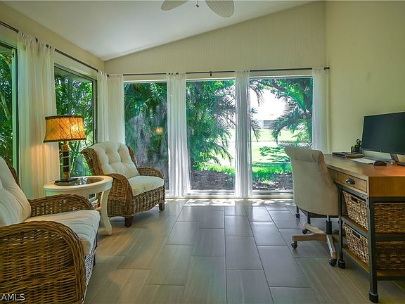 BEAUTY & OPEN SPACE, INSIDE & OUT. Enjoy single-family privacy and comfort with a maintenance-free condo lifestyle in this turnkey detached villa. Set in quiet Millpond community of luxurious Gulf Harbour, a shrub and flower-lined entry leads into an amazingly open and tastefully furnished interior. Sunlight pours in from the window-enclosed sunroom, flooding the spacious living area. The transition is completely level, no need to step up or down. A view of 5th green serves as pastoral backdrop. A crystal chandelier in the living room prisms daylight and sparkles at night. There’s a surprisingly large updated kitchen with high level granite countertops that have a flowing pattern. You’ll find plenty of uniquely finished cabinets, a pantry and backsplash that is both tasteful and functional. Stainless appliances. The kitchen door conveniently opens to 2-car garage. The primary bedroom easily accommodates a king bed and dresser set. There’s a walk-in closet. Updated ensuite bath has twin sinks with granite countertops. Guest bedroom has space for king bed and dresser as well and it has another large closet. Nicely updated guest bath. The unit is widely separated from neighbors so you can relax on your patio in private. Just a short walk to the community pool. The additional Gulf Harbour amenities of golf, tennis, staffed fitness center, marina and two restaurants do require an optional membership. Pickleball is available to all residents. Close to airport, Twins and Red Sox stadiums and plenty of shopping. Surrounded by a wide variety of restaurants.