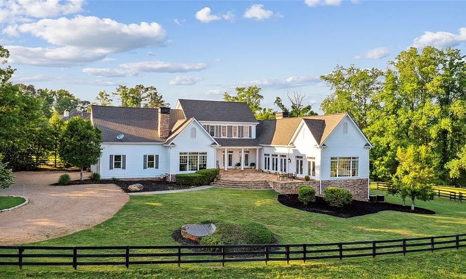 For the equestrian enthusiast and most discerning buyer, this Virginia Farmhouse home sits on Milton's most highly coveted street, Wood Road. A private setting amongst rolling green hills, this land is simply unmatched in the equine rich Milton heartland, yet just moments to downtown Alpharetta and Avalon restaurants and retail. With its very own private entrance, the fifteen stall Show Barn comes equipped with two Tack Rooms, two Wash Stalls, Office, and Professional Riding Ring. For the dreamer this space could be used for a multitude of events and/or celebrations. The home itself has seven bedrooms and five full bathrooms. The main level living is flooded with elegance surrounded by views of the alluring green fields beyond compare. Simple elements like timeless wood, brick, and stone finishes provide an appreciation for the sophistication of the space. The architecture and landscape create an elevated experience of the quintessential Milton, equestrian lifestyle.