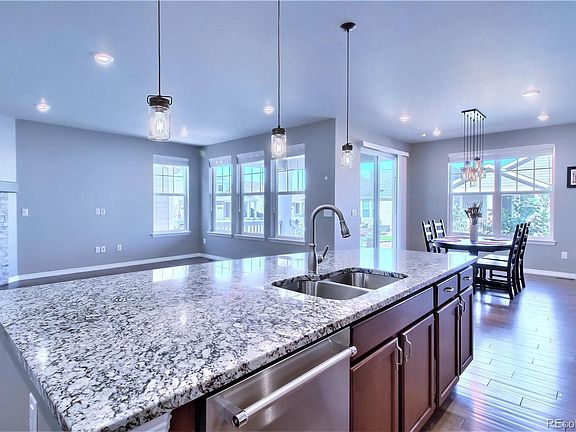 Gorgeous ranch home located in highly sought after Heritage Todd Creek golf course community! Custom finishes/upgrades throughout including 9' ceilings, engineered hardwood floors, designer paint, 8' interior doors & coffered ceilings. Open-concept living features a gourmet kitchen with SS appliances, double oven, 5-burner gas range, granite counters, 42" Mocha cabinets, pantry, expansive granite center island with breakfast bar seating. The light-filled family room flows seamlessly off of the kitchen & boasts a corner gas fireplace with custom tile surround. Spacious main floor master has a beautiful en suite bathroom with oversized shower & walk-in closet that conveniently connects directly to the laundry room. Guest bedroom with adjacent full bath is conveniently located on the opposite end of the home. A large office/den with French doors is prefect for working from home or could be easily converted to an additional bedroom or even formal dining room. Full finished basement with conforming 3rd bedroom, full bathroom, huge rec room, workout room (or craft room), plus 2nd office/study & large storage room. East facing covered back deck is perfect for coffee in the mornings or enjoying dinner & drinks in the shade during the evenings. This home also has one of the larger back yards that has been professionally landscaped & is highlighted by the custom water feature. Heritage Todd Creek is a premier Active Adult 55+ gated community with 18-hole golf course, clubhouse, indoor/outdoor pools, hot tub, fitness center, tennis courts, social clubs & groups, neighborhood restaurant and miles of walking paths. Incredible location that's minutes away from Larkridge, Top Golf, Costco, Home Depot, The Orchard, brand new Denver Premium Outlets plus quick access to E-470, DIA, Denver and Boulder. Main floor laundry, finished garage with epoxy flooring, radon mitigation, turnkey condition, south-west facing driveway, low traffic street, quick possession - this home has it all!