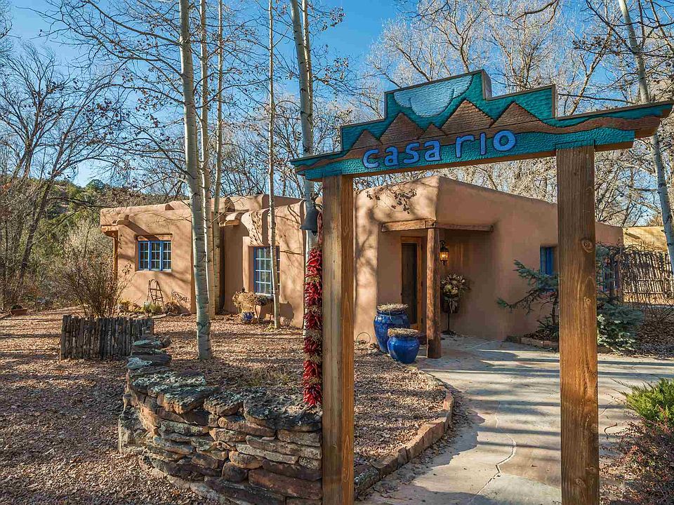 Welcome to Casa Rio - the house on the river - A charming, country compound shaded by mature trees. This private, gated sanctuary is only four miles from the Santa Fe Plaza and 0.8 miles to the Tesuque Village Market, along a scenic, tree-lined road. Exquisitely expanded by the current owners, the compound comprises main house, garage, studio, private office and bunkhouse. A glorious light pervades the interiors. No expense was spared in selecting the finishes, from the diamond plaster walls, flooring, to the bathroom and kitchen accents. The main house has two bedrooms, two bathrooms, living area, two dining areas, well-equipped kitchen and shaded entertaining portal overlooking the river. Across from the main house the ground level of the newer structure houses the large two-room artist studio (a flexible use space), wine cellar/tasting room, private study, bathroom and two-car garage, with workshop and additional storage. The guest/bunk house, which sleeps eight, is on the upper level, with two bedrooms, living area and bathroom, romantically perched in the treetops. The proximity to Santa Fe and the Opera offers rental opportunity. Throughout there is efficient use of space. Thoughtfully landscaped, with a path leading to a bench by the river, this property enchants.