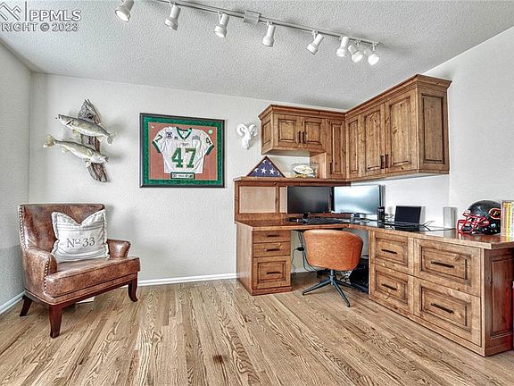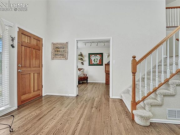 Welcome to your dream home on the north side of town! This exquisite 4-bedroom, 4-bathroom in School District 20 offers an abundance of modern amenities and is conveniently located just minutes away from the prestigious Air Force Academy, I-25, shopping centers, hiking trails, restaurants, entertainment options, and schools. The main floor boasts brand new hardwood floors throughout, creating a warm and inviting atmosphere. The elegant office space features Knotty Alder Pine cabinets with soft-closing doors that offers the perfect work-from-home sanctuary. The kitchen features luxurious granite countertops and island that not only enhance the aesthetics but also provide a durable and practical surface for your culinary endeavors. All four bedrooms have ceiling fans for comfort, and the home has central air ensuring pleasant temperatures year-round. The master bedroom is a true retreat with a Pine Beetle finished wall, a sliding barn door for added privacy, and its very own sitting area with a cozy gas fireplace, creating a perfect haven for relaxation. The finished basement offers additional living space, 4th bedroom and bathroom with a walk-in shower. A professional-grade gym space with premium flooring awaits fitness enthusiasts, making it easy to stay active and healthy from the comfort of your own home. Outdoors, a gas firepit provides the perfect setting for cozy evenings, making it an ideal spot for gathering with family and friends. The 10x12 gazebo offers a charming space for outdoor dining and relaxation, allowing you to enjoy the beautiful Colorado weather in style. The two-car tandem garage is not only spacious but has plenty of cabinet space for storage for all your DIY projects, making it a handyman's dream. This property seamlessly blends modern elegance with practical functionality, making it the perfect place to call home. Don't miss the opportunity to make this exceptional residence yours! Schedule your viewing today!