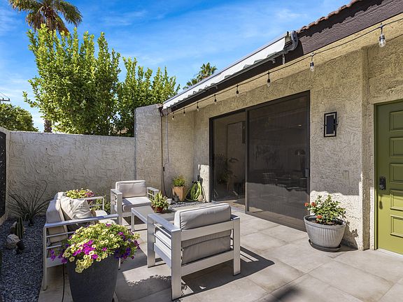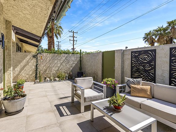 Located in the heart of Palm Springs in the sought-after community of Palm Regency is this tastefully and fully remodeled two-bedroom two-bathroom condo. Light filled and voluminous, any sight line obstructions have been tactfully removed, allowing you to see the entirety of your open concept living space from anywhere in the main portion of the home. It's perfect for entertaining large or small groups, with a large, private, back patio and generously sized bedroom suites that maintain complete privacy from the living areas. Some features of the property include a stunning kitchen with custom cabinets, waterfall quartz island and countertops, and stainless-steel appliances. Beautiful porcelain tile floors throughout brighten the space and add continuity to the floor plan along with a dining room skylight that provides abundant natural light. Both bathrooms are fully done and impeccable. All of that and there's a one car attached garage with one additional uncovered parking spot. Palm regency offers 2 large pools, 2 spas, tennis courts, and a clubhouse! This home is a must see.