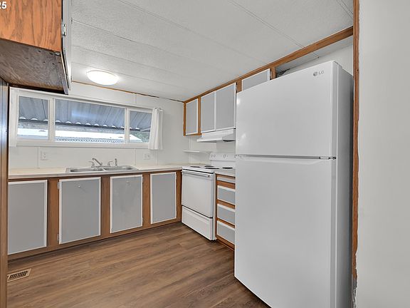 55+ Park. No Land. Home Only. Recent upgrades to this charming home include a brand-new refrigerator (2024), a 5-year-old roof, and a water heater that's only 2 years old. Fresh laminate flooring and carpets were installed in May 2024. For year-round comfort, there's a ductless heat pump. Current annual taxes are $00.00. The spacious living room features large windows for plenty of natural light. The master bedroom offers built-in drawers for convenient storage, and the second bedroom also includes built-in drawers. The hall bathroom has laminate flooring and a tub/shower combination. The washer and dryer are included for your convenience. The kitchen comes with the almost-new refrigerator and range/oven. Enjoy the outdoors with two decks and a raised garden bed in the back. Take advantage of the park’s amenities, including a post office, library, meeting room, billiards room, hot tub, and seasonal pool. Fantastic location within the park and centrally located in Eugene! CASH SALE ONLY! 1975 Home.