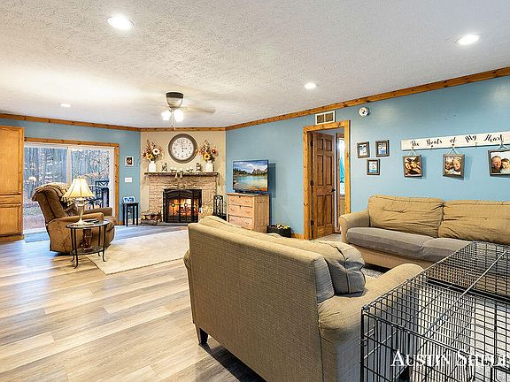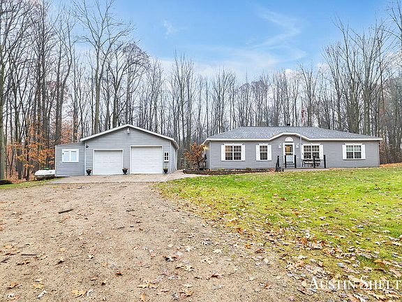 Welcome to 1475 Stalhood Dr! This charming ranch is tucked among almost 2 acres of beautiful woods, offering a peaceful setting with room to breathe and explore. Entering the home, you'll find a spacious living room with a wood-burning fireplace, and the eat-in kitchen includes an island with a butcher block top. The primary bedroom comes with an ensuite bath and a large walk-in closet, and another full bath services the other two bedrooms. Luxury vinyl plank flooring through the common areas and carpet in the bedrooms. A slider door off the living room leads to the back deck, facing the woods. The garage/pole barn has enough space to park two cars or one vehicle and a boat or camper. Picture yourself relaxing during quiet mornings under the trees and cozy evenings in this fresh and inviting space, and schedule your tour today!