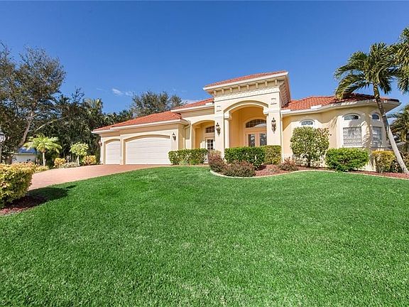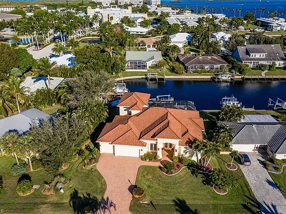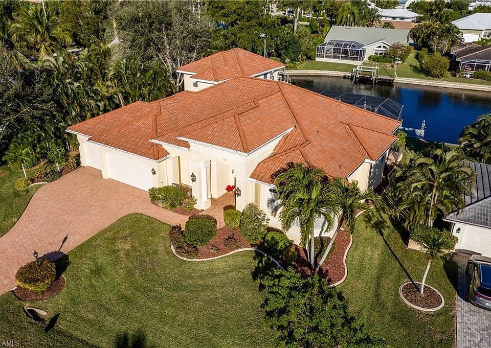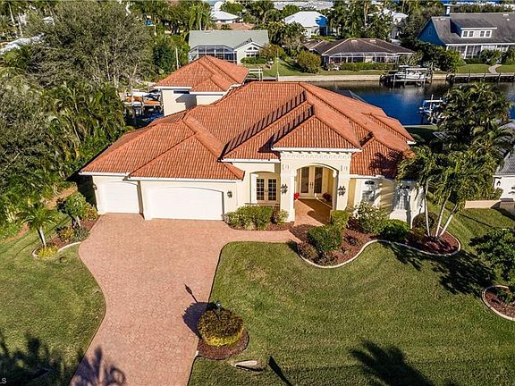 GULF ACCESS Custom luxury waterfront residence built by award winning Aubuchon Homes. Great room design planned for elegant, but casual living to capture the outdoors with a resort style pool and spa accented by a waterfall and also an outdoor shower for convenience. Great curb appeal with brick paver driveway, air conditioned 3-car garage, high ceilings, chef's kitchen, walk-in pantry, gas fireplace with custom built-ins in great room, and a total home audio system and generator. There is a guest suite upstairs with waterfront views perfect for visitors or teenager. This 3 bedroom, plus oversize den that could be used as fourth bedroom, 3 bath, waterfront home has gulf access, deep water, complete with wrap around dock, composite decking,10,000 lb. boat lift, shore power, and lighting. This home is a Must See!!! You will enjoy the wonderful private, peaceful setting. Close to beaches, shopping, and airport.