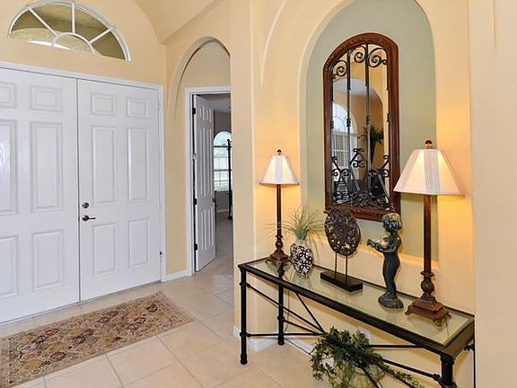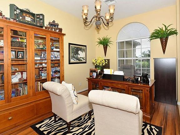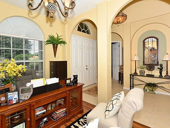 Gorgeous custom built home situated on a private almost half-acre preserve wooded lot, in Country Meadows, offering privacy and serenity featuring an open floor concept with a large great room. This one level open floor plan home features great room, formal dining room, four bedrooms and game room. The dramatic open foyer, with double entry doors, columns and arched openings, flows into the great room with gleaming bamboo hardwood floors that flows to the spacious kitchen with solid wood cabinets, granite counter-tops, newer stainless steel appliances. large breakfast bar and casual dinette. Impressive master suite with sitting area, walk-in closet and private bathroom with tub, separate walk-in shower and double vanities. The large bonus/media room is perfect for game room and features sliding doors to the extended paver lanai and half bath. The resort-style outdoor living area consists of large heated saltwater pool and covered loggia for easy outdoor entertainment. Other impressive benefits include: high volume ceilings. extensive landscaping on all sides, tile roof, window treatments and blinds, three car tandem garage, freshly painted interior, recessed tray ceiling, upgraded light fixtures and much more. Country Meadows is a deed restricted gated community with low HOA fees, NO CDD fees, A Rated schools, area park and close proximity to shopping. Such a warm welcoming home ! View the lake across the street !
