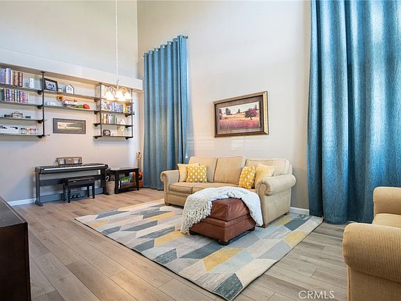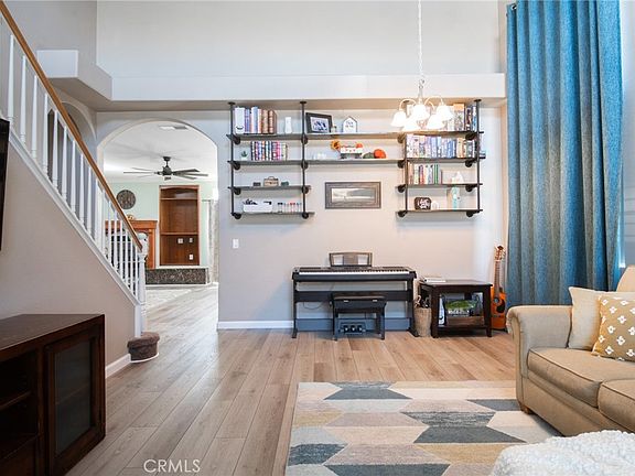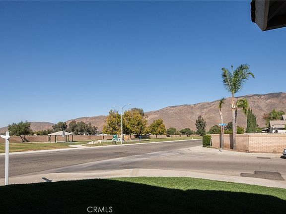 ****PRICE REDUCED*** LOVELY SAN JACINTO CORNER HOME ACROSS FROM PARK WITH MOUNTAIN VIEWS. BE COOL IN THIS HOME WITH NEWER PAID SOLAR. This 4 bedroom, 3 bath home is well suited for those who want an open floorplan. The 2 story ceilings in the living/dining room immediately bring a spacious feeling. The generously sized kitchen and family room continue the feeling of openness. Crown molding and updated vinyl flooring downstairs and shutters on most windows adds to the beauty of the home. A bedroom and bathroom are desirably located downstairs, which can be convenient for visitors or those who can’t manage stairs. A laundry room with sink and storage is also downstairs. The Primary Suite is amply sized and has a dual vanity, separate shower and tub, and nice walk-in closet. Additionally, there are two more bedrooms and full bathroom upstairs. Lots of lush green grass in both front and back yards for enjoyable outdoor time and a perfect front porch spot for taking in the park and mountain views. The back yard has a fenced raised bed garden area for growing vegetable or flowers. Other great money savers in addition to the PAID SOLAR are the new air conditioning condenser, heater coil and water heater. Also NO HOA and LOW TAXES. Neighborhood schools, shopping, and Mt San Jacinto College are all nearby.