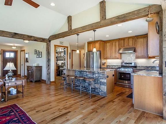 Lovely 7.18 acre farmette (2 lots,2 wells). Nestled in heart of Blue Ridge Mountains adjacent to beautiful Roach River. Only 29 min to Cville. Soaking up panoramic views this easy living craftsman style ranch with full finished basement was built with multi-generational or in-law suite in mind. Energy efficient solar panels, 2x6 walls, R21 insulation, Superior Foundation Walls, Rinnai tankless water heater, 2 zoned heat pump, and solar reflecting blinds. 3 full baths have heated floors. Hickory cabinets. Stainless steel appliances. 2 kitchens. Wide oak floors. Travertine stone and ceramic tile. Oak fireplace mantle, raised hearth. Pine trimmed windows. Separating dining and living rooms are chestnut beams from 1700's barn at MD country club