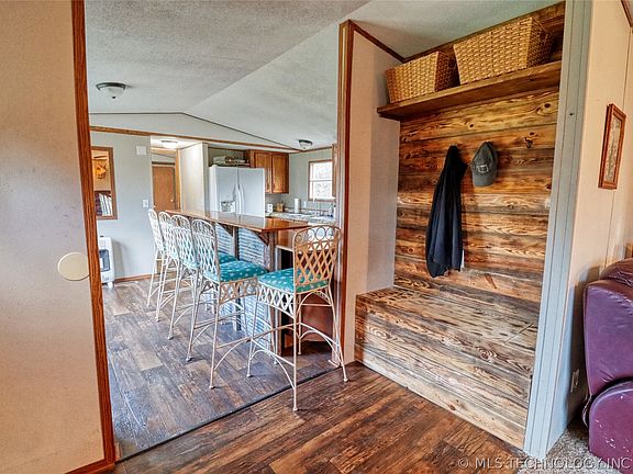 Secluded by trees and sitting off the highway this 3 bedroom/2 bath home would be a great space to live while you build. Minor updates have been made throughout the home. Utilities are available for a second mobile or RV. One shop has cement while the others could be used for storage. The land includes a pond. Easy access to Highway 69 to McAlester or Eufaula.
