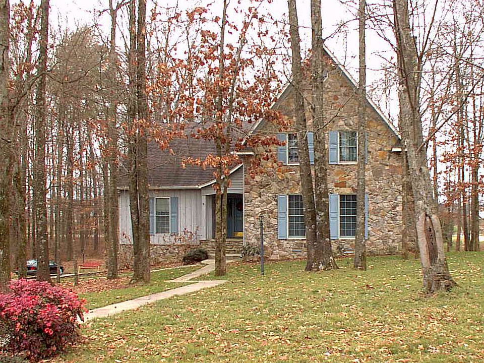 southern Living model home design. cedar siding, stone fireplace and chimney, sun room,