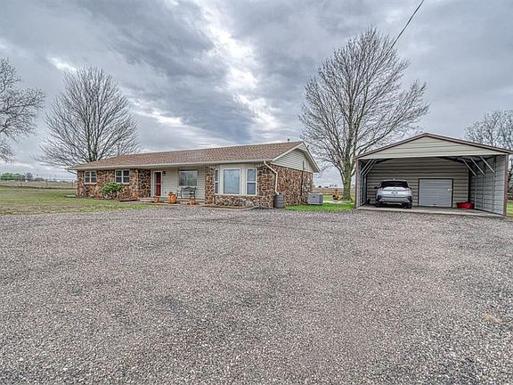 This 3 bed, 2 bath home is nestled on 2.15 acres, offering a perfect blend of countryside serenity and convenient access to town amenities with ample space for comfortable living! Step inside to discover a well maintained, clean, spacious interior with a welcoming living area. Sunlight pours in through updated windows in the bonus all-seasons room boasting stunning views! This property has great features including an updated kitchen with SS appliances, updated bathrooms, den/study, a covered carport with an added shop, and a below ground storm shelter, a set up for a generator to plug right in & many more. The home is also equipped with a water purifier & softener to enhance the rural water system. The home is maintenance free with rock & vinyl along with guttering.