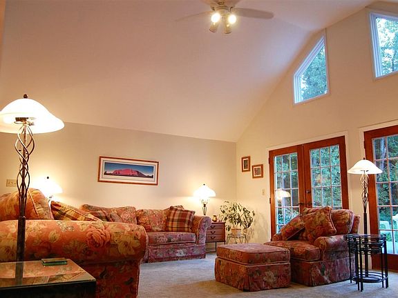 Your Private Hideaway-Custom ranch on 6.89 acres. Master suite w/hardwood floors, office, loft space and french doors opening to deck area. Open dining/LR boasts cathedral ceilings and double french doors that allow multitudes of natural light. Eat in kitchen w/radiant heat, SS app and granite counters. Need more space-wonderful 24x24 family room. 2 bay attached garage for cars and a detached garage for "toys" Agent related to seller.