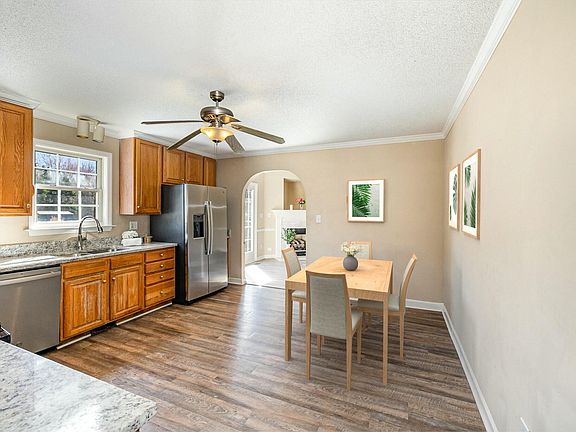 This charming ranch home sits on a spacious, partially fenced lot, offering plenty of room to relax and entertain. Featuring 3 bedrooms and 2 baths, this home also includes a versatile flex room, perfect for an office, playroom, or additional living space. The large family room is ideal for gatherings, complete with a cozy fireplace, while both the living area and primary bedroom boast vaulted ceilings, creating an open and airy feel. There is a large kitchen with eat-in space, granite countertops, and plenty of room to prepare meals. The primary bath features dual sinks and a soaking tub for the ultimate in relaxation. Walk-in closets provide ample storage in both the primary bedroom and secondary bedrooms. The home's huge, oversized driveway can accommodate several cars, ideal for families and guests. Outside, enjoy the deck shaded by a Sunsetter retractable awning, overlooking the expansive backyard. A large shed offers extra storage or workspace. All appliances are included, making this home move-in ready!