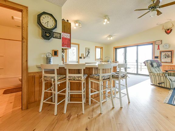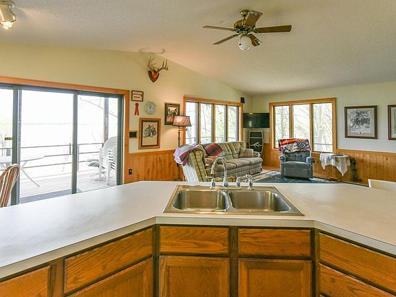 First time offering! Your breath will be taken away as you overlook Gull Lake's sunrise. Home features an open style floor plan, spacious kitchen, dining overlooking the lake, large living room, wood burning fireplace, two bedrooms main level, large covered deck, tiled basement floor, walkout basement, wood burning fireplace in family room and ample storage. Property boast 230 feet of waterfront, over an acre of heavily wooded oaks, Tram to waters edge, dock, and lift to be included. In floor requires boiler. Must See! Don't Wait!