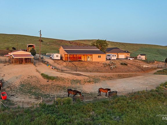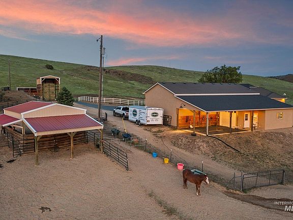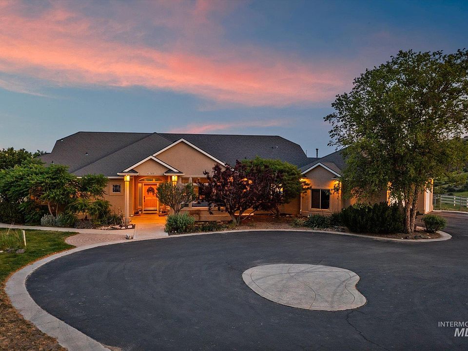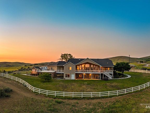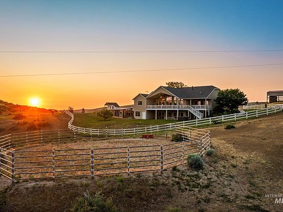 Experience elevated living in the Boise Foothills on this ~11-acre estate with panoramic views and direct access to the Ridge to Rivers trail system. Just 10 miles from downtown Boise or Eagle, this unique property offers a blend of natural beauty and urban convenience. The extensively remodeled home features 5 bedrooms, multiple flex spaces, a chef’s kitchen with Thermador appliances, radiant heated floors, custom library, office with serene views, and a luxurious primary suite. The great room opens to a south-facing deck with stunning vistas. Prepped for equestrian use, the grounds include a round pen, permitted shelters, tack/stall area, and solar-powered privacy gate. Ample storage for cars, toys and equipment with an attached 3-car garage plus a detached 3-bay garage with loft and half bath. Bonus: a new, heated chicken coop and run—complete with a guest swing. A rare foothills retreat offering space, style, and endless recreation.