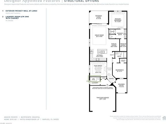 Baypointe Coastal - The Baypointe's welcoming covered entry and foyer flow into the spacious dining room and great room with a view of the desirable covered lanai beyond. The well-designed kitchen is equipped with a large center island with breakfast bar, ample counter and cabinet space, and a roomy pantry. The serene primary bedroom suite is complete with a sizable walk-in closet and spa-like primary bath with dual-sink vanity, luxe glass-enclosed shower, and private water closet. The secondary bedroom features a roomy closet and shared access to a full hall bath. Additional highlights include a versatile flex space off the foyer, centrally located laundry, and additional linen storage.