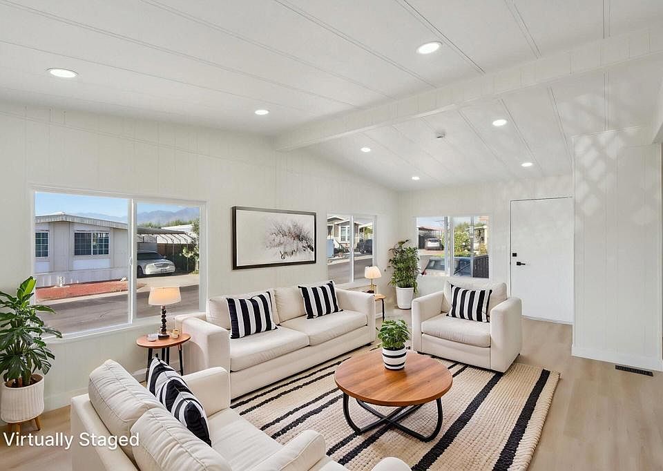 COMPLETE INTERIOR REMODEL! This beautifully reimagined home blends modern upgrades with open, comfortable living. The expanded kitchen and vaulted ceilings create a bright, airy feel that connects seamlessly to the family and dining rooms, perfect for both daily living and entertaining. Luxury vinyl flooring, quartz countertops, stainless steel appliances, energy-efficient windows, and recessed lighting are found throughout. From the living room and raised front porch, enjoy sweeping Southwestern mountain views. The chef's kitchen flows to a spacious family room with slider access to the front patio, while the dining room offers built-in cabinetry for added storage and display. The primary suite features a spa-inspired bath with shower stall, free-standing soaking tub, and generous vanity space. The laundry room is designed for convenience with a sink and extensive cupboard storage. Sky's Haven is one of Desert Hot Springs' premier 55+ gated communities, featuring three pools, spa, clubhouse, fitness center, sauna, billiards, and park area, along with a full calendar of social and recreational activities. Best of all, you OWN THE LAND with low HOA dues, and all utilities are billed through the HOA. Ideally located just 15 minutes from Palm Springs and 20 minutes from Morongo Casino Resort & Spa in Cabazon, this home offers both comfort and lifestyle in a highly desirable setting.