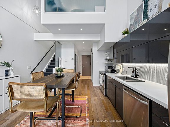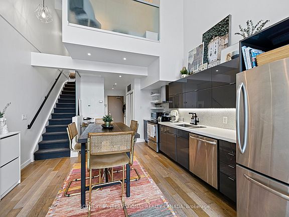 Urban loft living in the heart of Queen West. This rare, boutique four-suite building blendsindustrial character with modern finishes. A wall of south facing floor-to-ceiling windowsbathes the open living/kitchen in light, while the 18' exposed industrial ceiling adds dramaticvolume. The sleek kitchen features stainless steel appliances and quartz countertops. Hardwoodfloors, a convenient main floor powder room, and a Juliet balcony complete the main level.Upstairs, a spacious bedroom includes a 3-piece bath. At 865 sqft and maintenance fees at just$377.66/m, this is an incredible opportunity to get into a well run boutique building.Unbeatable location with the TTC, restaurants, cafés, bars, and boutiques just steps away.