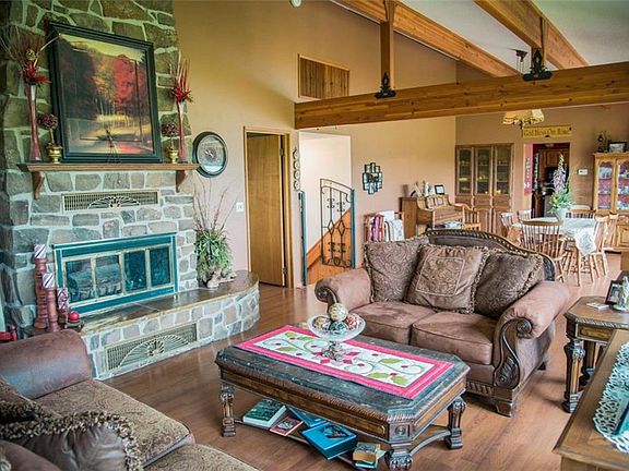 Gorgeous home with equally gorgeous view! This 4BR 3 Bath unique home features cathedral ceiling with wooden beams, fireplace in the living, wood stove in family room, a study, a living room downstairs with a craft room/bonus room. All on 8.28 acres with an in-ground pool!