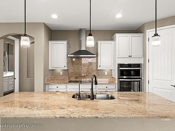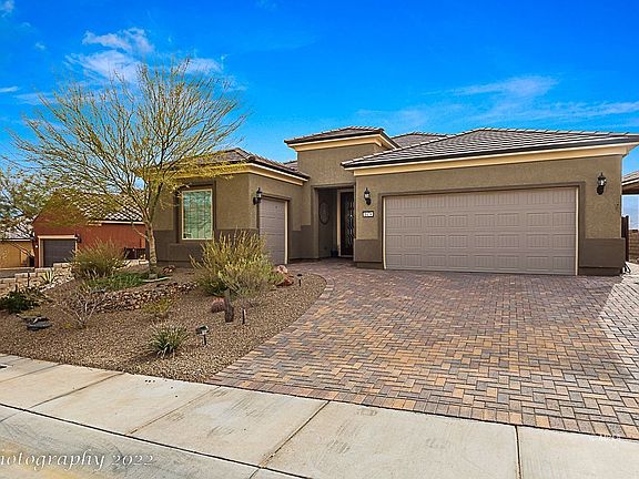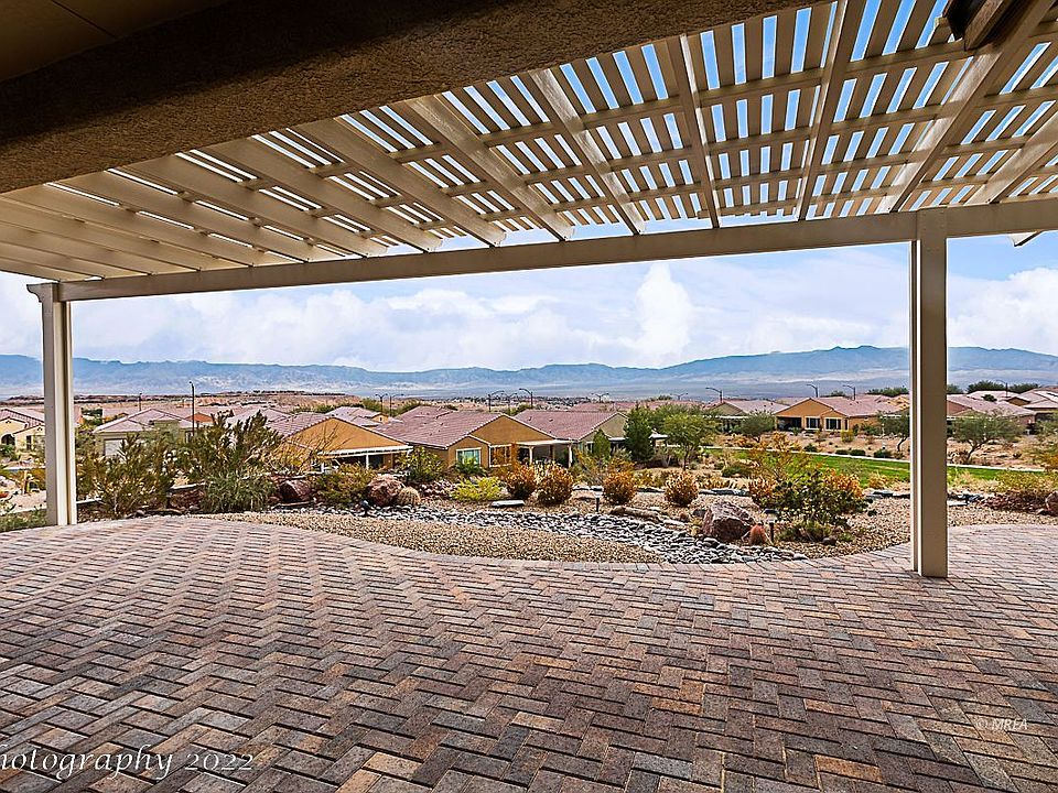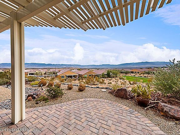 You will be WOWED from the moment you walk through the beautiful custom 8' front door of this move-in ready home! The southeast views of the AZ/NV mountains, from inside & outside this home, are stunning! The elevated cul-de-sac lot is perfect for enjoying Mesquite's weather. The costly wood-look tile is extended throughout the living space. The upgraded center slider patio door leads to an exquisitely landscaped yard with an extended patio with pergola for year round enjoyment. No expense was spared in the design choices. The chef's kitchen has an executive counter-height island, upgraded granite, top of the line cabinetry, & stainless appliances---refrigerator stays! The kitchen looks out to a courtyard with a privacy screen & custom pergola. Enjoy the panoramic views from your dining room table, living room, and even your office/den area! The main suite is designed like a luxury vacation retreat. Enjoy the panoramic views from the bay window. The main bath has a large easy entry shower. The washer & dryer are included. Large laundry room with plenty of custom shelving & sink.Fans, costly plantation shutters throughout. Wait--there is more! Attached golf cart garage & SID paid!