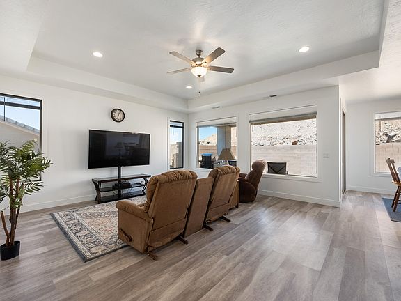 Gorgeous home in the new and growing community of Painted Sands that has been perfectly maintained and cared for. Upon entry, you're delighted by an open concept floorplan with LVP in high traffic areas, surrounded by many windows allowing ample natural light. The kitchen has an island perfect for entertaining, stainless steel appliances & dining area with a doggy door and access to your large private and covered patio. Great mountain views beyond the fully fenced and landscaped yard. 2-car garage is 22x22 with 18 foot garage door. Easy access to many attractions such as; schools, shopping, healthcare, Sand Hollow & Quail Lake.