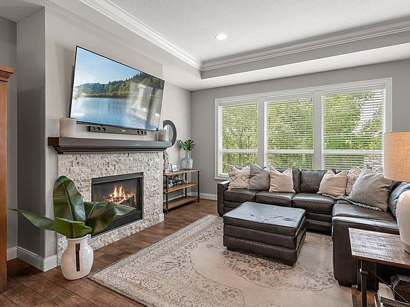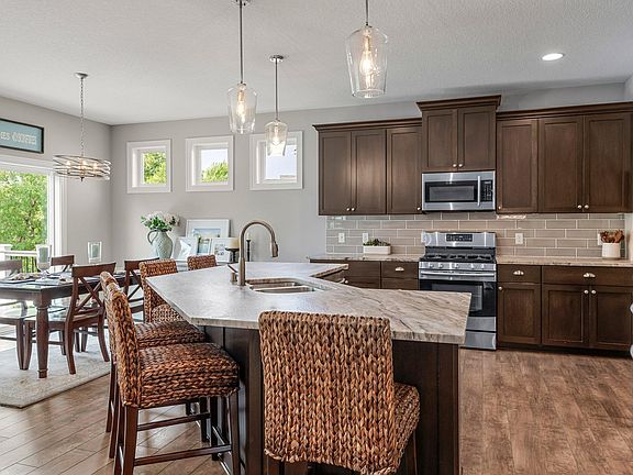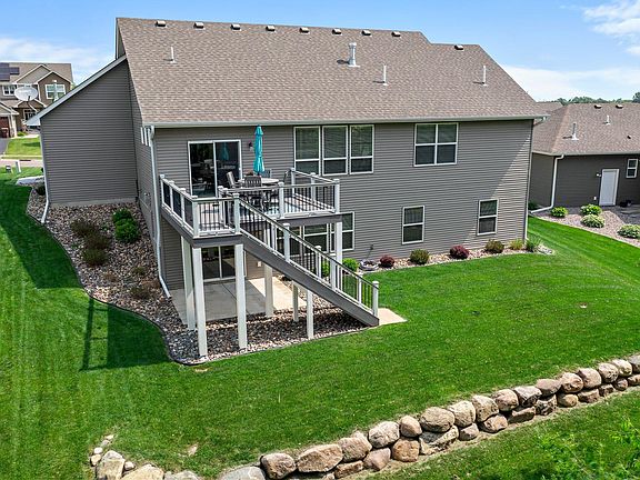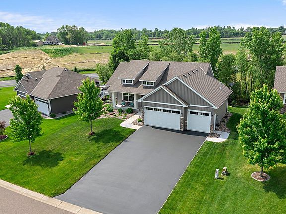 Exquisite modern rambler with a bright, open floor plan, showcasing a grand living area with a tailored fireplace and a striking tray ceiling. The state-of-the-art kitchen impresses with stainless steel appliances, warm wood cabinetry, a spacious angled island, and elegant leathered marble countertops (which can also be found throughout the home). The peaceful primary suite features a tray ceiling, walk-in closet, ceramic tile flooring, a spa-style shower, and dual vanities. The fully finished walk-out basement is ideal for hosting, with an expansive family room, two bedrooms, a 3/4 bath, wet bar, and a cozy fireplace. Unwind on the maintenance-free deck (2018), enjoying a secluded, tree-lined backyard with no rear neighbors and an upgraded sprinkler system (2023). The insulated, heated 3-car garage includes an extended third stall, perfect for a workshop, and a practical sidewalk at the service door (2018). Rustic laminate flooring, sleek white trim, wood blinds (2017), abundant storage, and a large pantry enhance the home’s charm. Recent updates include new flooring in the primary bedroom and office (2024) and a washer and dryer (2023). Perfectly situated near Target, Coborn’s, restaurants, and Rockwood’s summer live music, with easy access to Albertville, Elk River, Rogers, Hwy 101, and I-94.