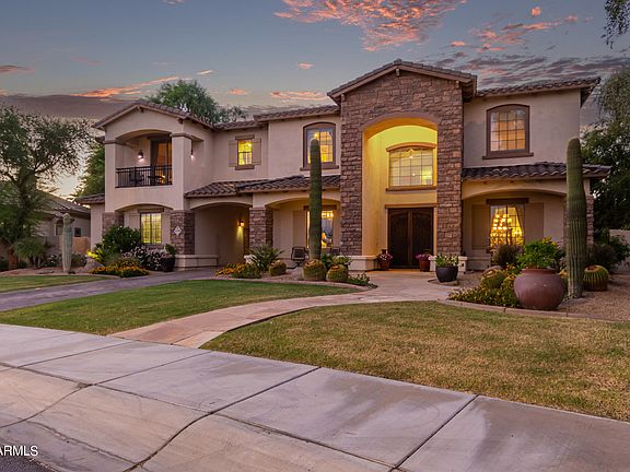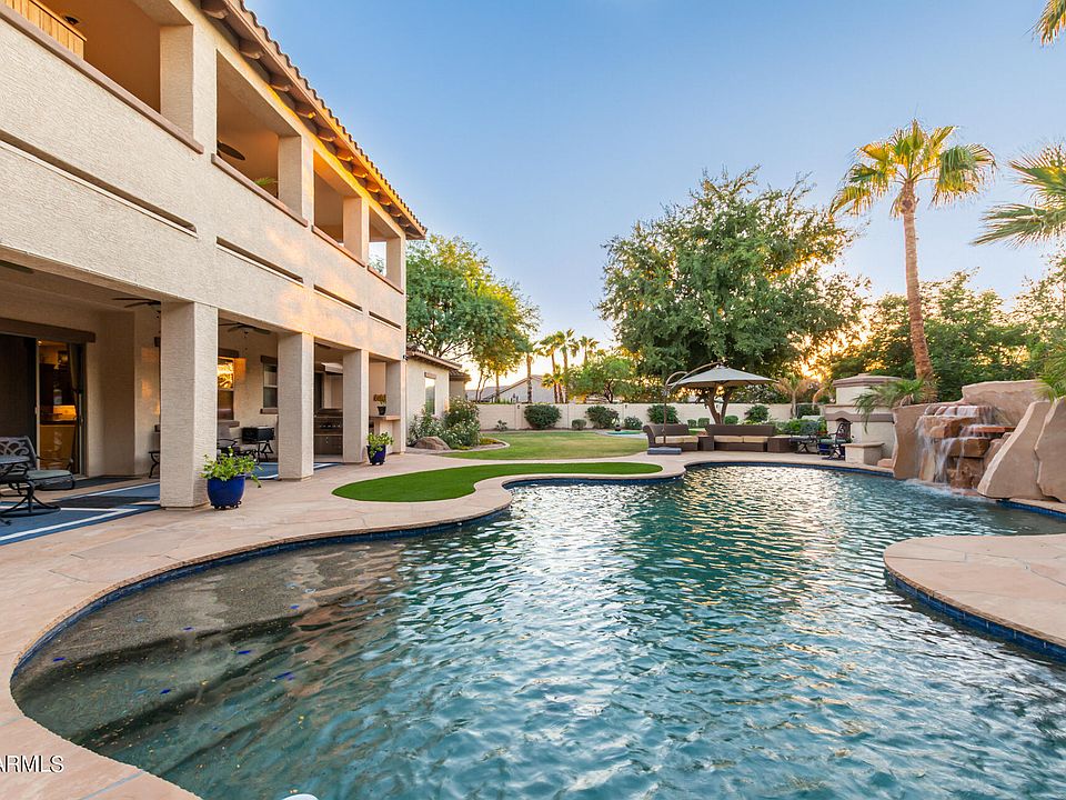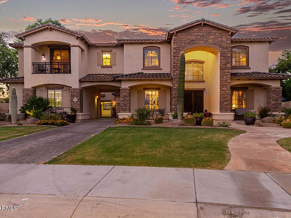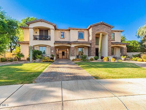 WELCOME TO PARADISE - This is a luxury Toll Brothers former model home located in The Village at Litchfield Park, Tuscan style, 5642sqft, 4 bdrm, 5.5 bath on oversized 0.4 acre lot. Grand double door entrance with screened security door opens to travertine floors leading to separate living room and formal dining areas with 22 ft ceilings and wood floors. Den/office with wood floors, built-in bookcase and dry bar with granite counter, cabinets, and a built-in wine refrigerator. Formal dining room with wood floor, wall sconces and large windows. Travertine floors continue into the guest half-bath adjoining the den and throughout the open main floor family room, kitchen area, breakfast nook and hallway leading to the laundry room, and the main floor bedroom with ensuite full bath & much more