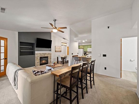 Gas fireplaceBreakfast barVaulted ceilingsOpen conceptLots of storageNatural lightingNewer carpet