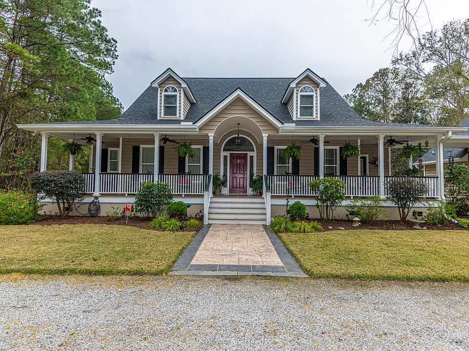Beautiful Lowcountry home on a picturesque 3.4 acre Land Trust protected lot! Travel through the woods to this totally private oasis, a circular driveway wraps around a large cascading 7-foot fountain. The extra-wide wraparound porch is welcoming, perfect for taking in nature or hanging out with family & friends. Hardwood floors run throughout the main level. High ceilings in the entry & family room along with large windows make the home bright and airy. A large chef's kitchen with custom cabinets, premium appliances, quartz countertops extensive crown molding, under-counter LED lighting. Enjoy a morning coffee or evening glass of wine while watching abundant wildlife from the sunroom. Better yet, hop in the invigorating hot tub & watch the meteor showers!